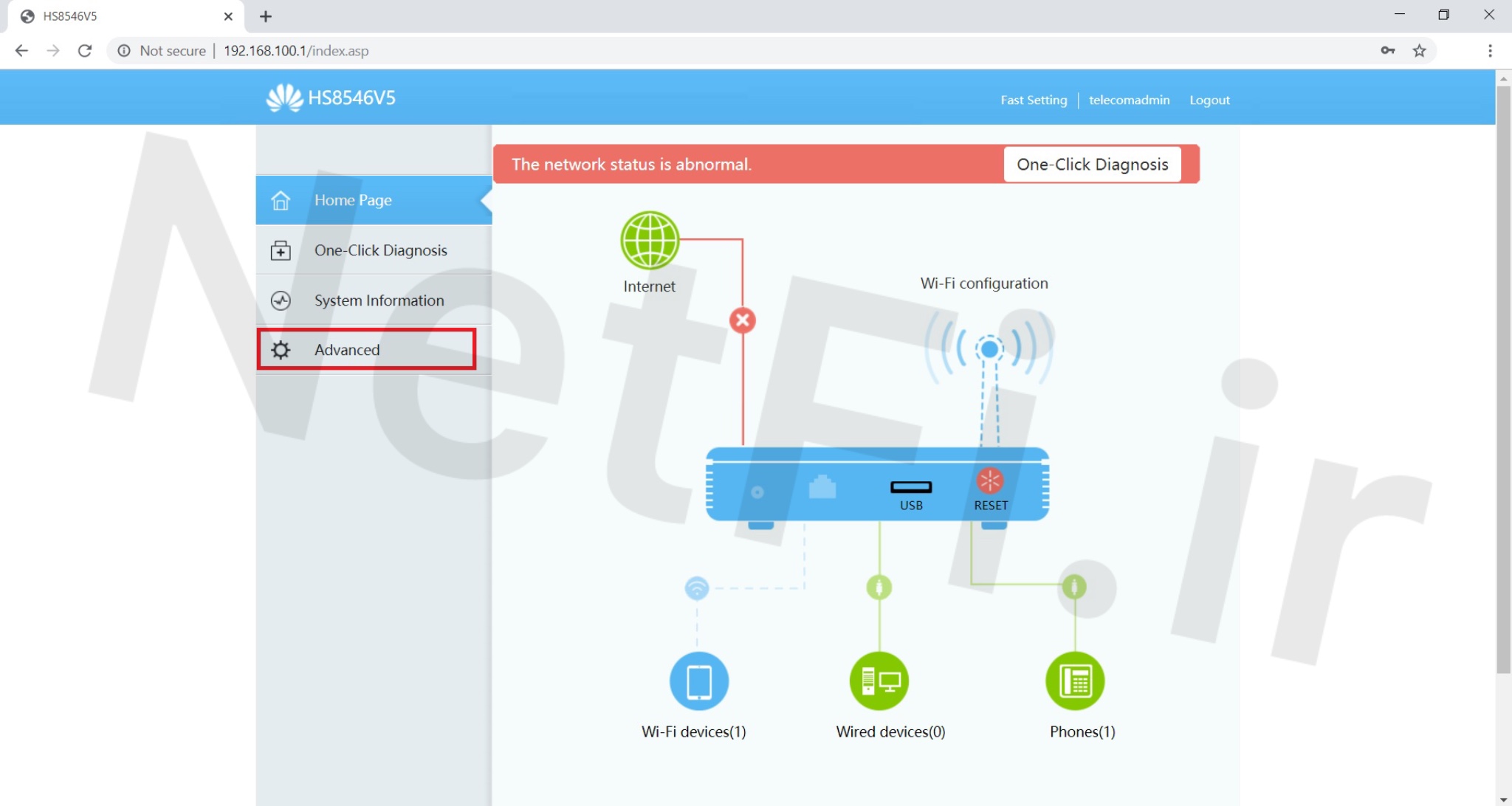 به دلیل اینکه پورت های شبکه مودم های هواوی به طور پیش فرض غیرفعال است و در ابتدا اگر با کابل شبکه متصل شوید سیستم شما به طور اتوماتیک از مودم آی پی نمیگیرد پیشنهاد میشود برای انجام تنظیمات اولیه از طریق وای فای متصل بشوید