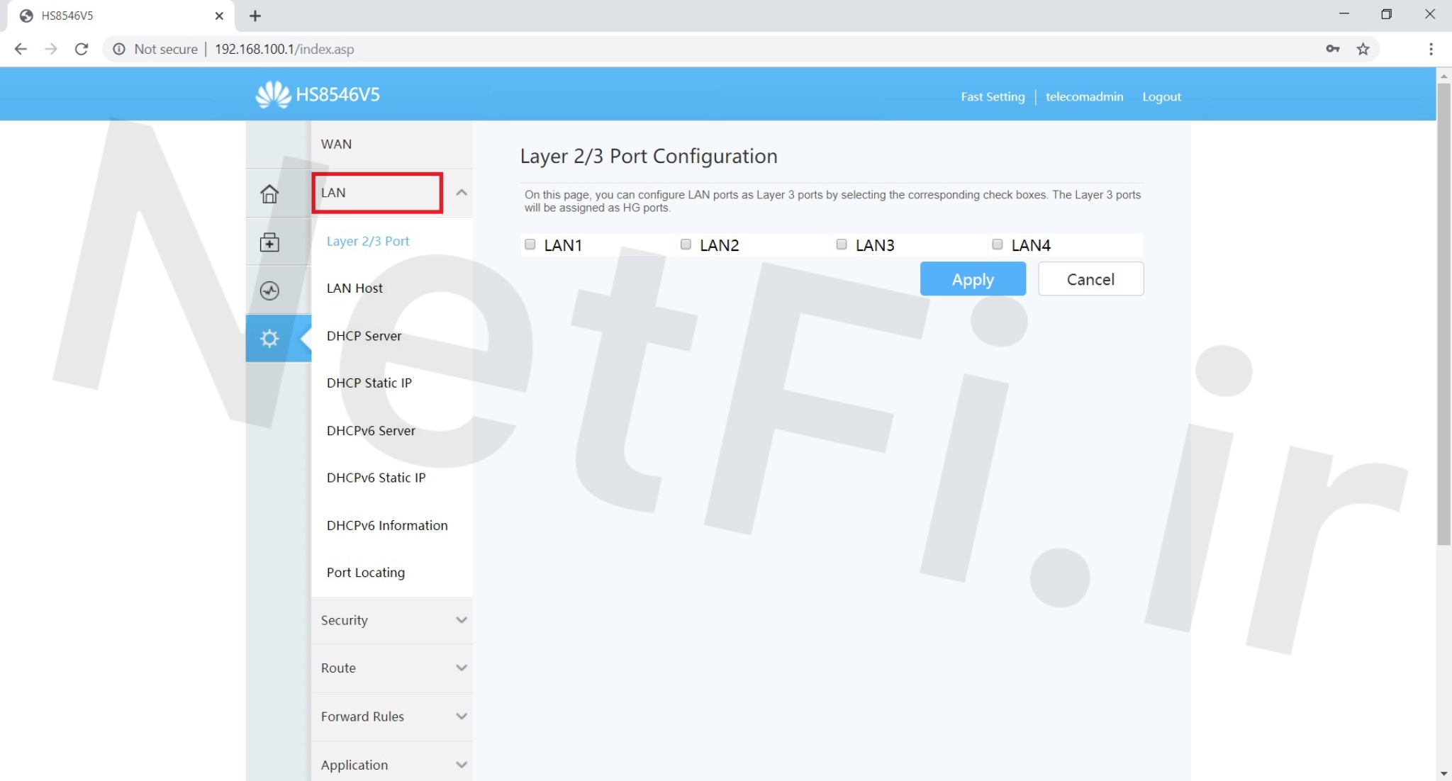 در مرحله بعد مطابق شکل زیر قسمت LAN را انتخاب کنید و پورت های Lan مودم را فعال کنید تا از این پس سیستم شما از طریق کابل لن متصل شود و اتوماتیک آی پی بگیرد