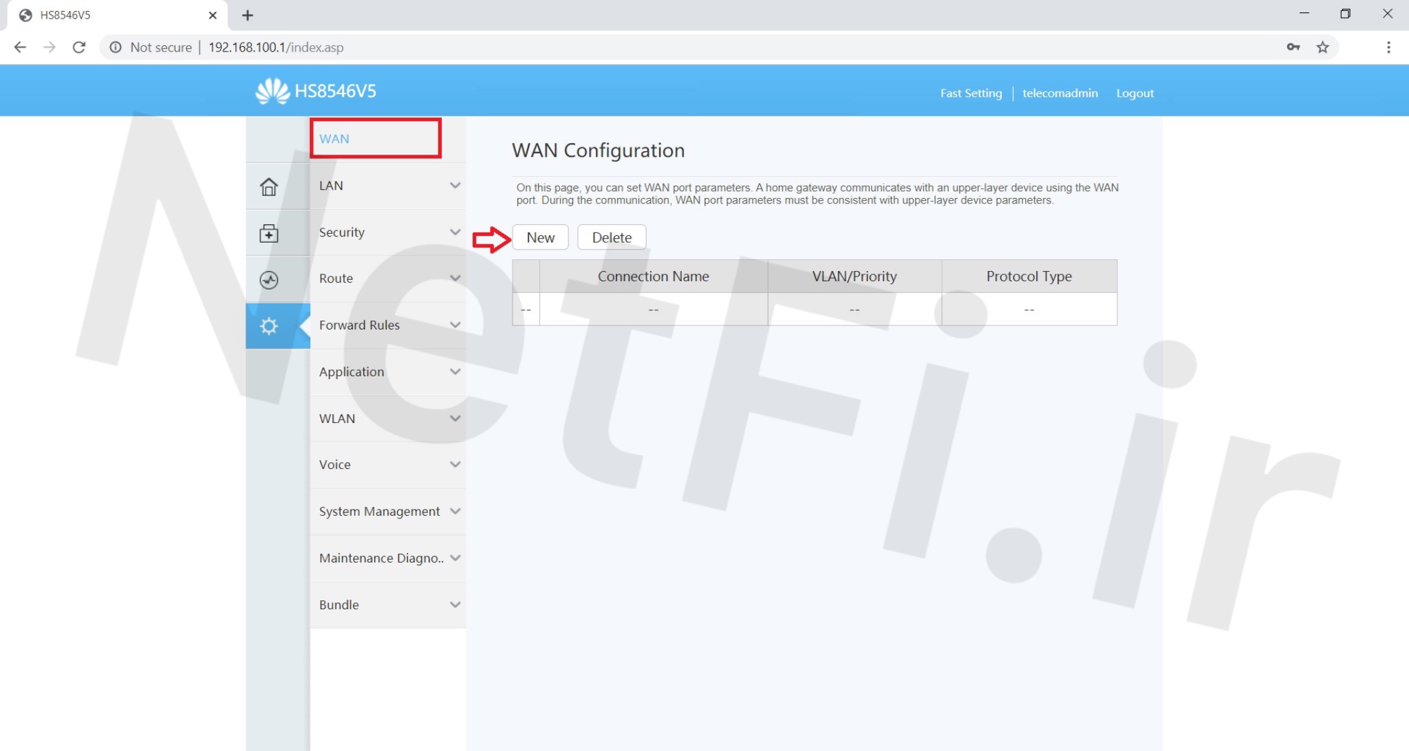 پس از فعال کردن پورت های لن مودم ، مطابق تصویر زیر وارد قسمت WAN بشوید و گزینه NEW را بزنید