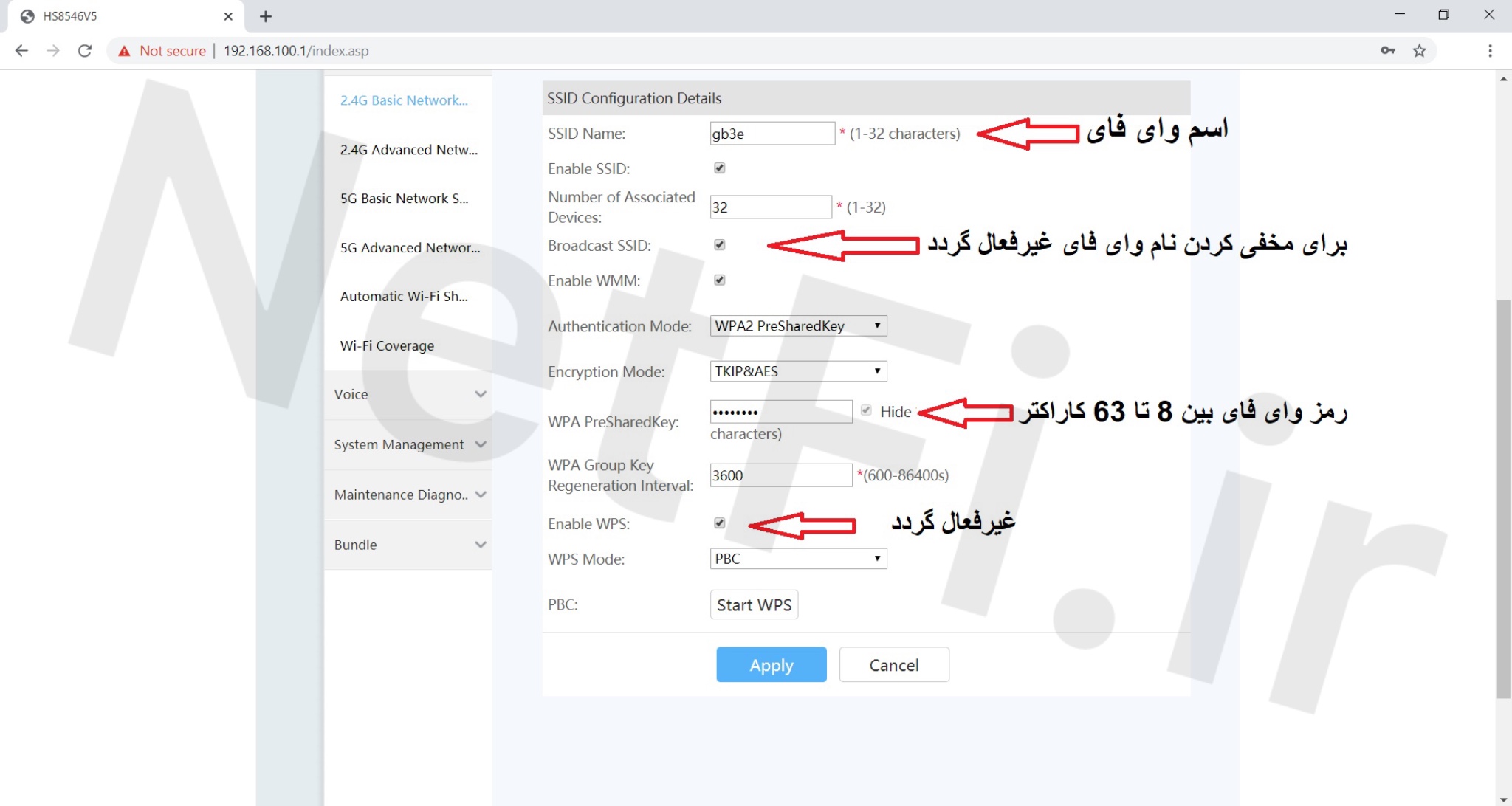 در قسمت WPA PreSharedKey رمز وای فای خود را میتوانید تغییر دهید که این رمز باید بین 8 تا 63 کاراکتر باشد